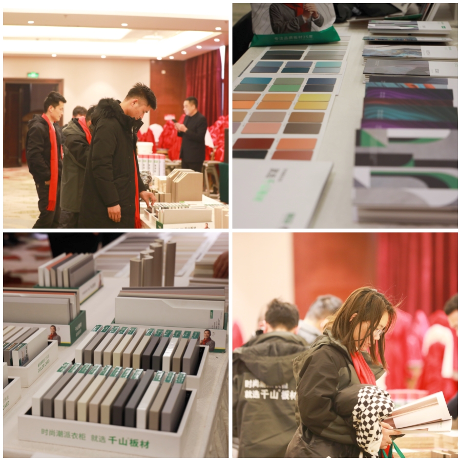 活動現(xiàn)場設(shè)置了產(chǎn)品、樣冊、花色展示區(qū),讓參會嘉賓們零距離感受千山板材的產(chǎn)品魅力,全方位了解千山板材的品類優(yōu)勢和產(chǎn)品優(yōu)勢。