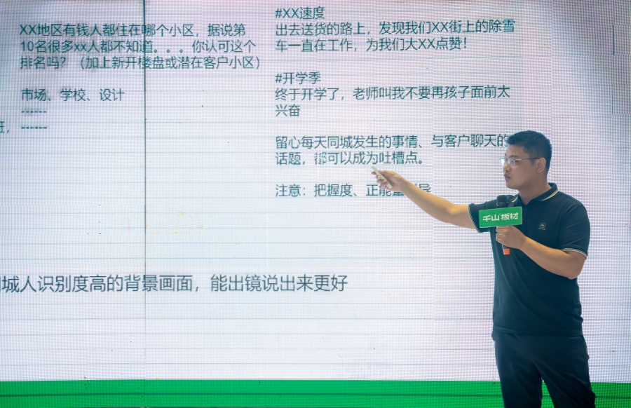 千山板材大區經理王殿忠致辭。王經理分享到,行業競爭壓力存在的同時也涌現出了機遇,千山將與伙伴們一起抓住機遇,形成事業共同體,多維度進擊,多渠道拓展,最終轉化為效益增長。