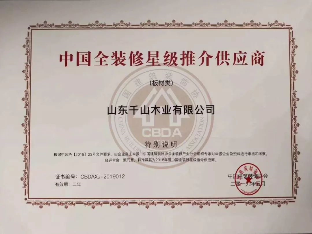 2019年5月,千山憑借高質(zhì)量的產(chǎn)品、良好的信譽(yù)成功入圍由中國建筑裝飾協(xié)會主辦的2018年度《全裝修供應(yīng)商推介目錄》企業(yè)名單及《全裝修星級供應(yīng)商推介目錄》。