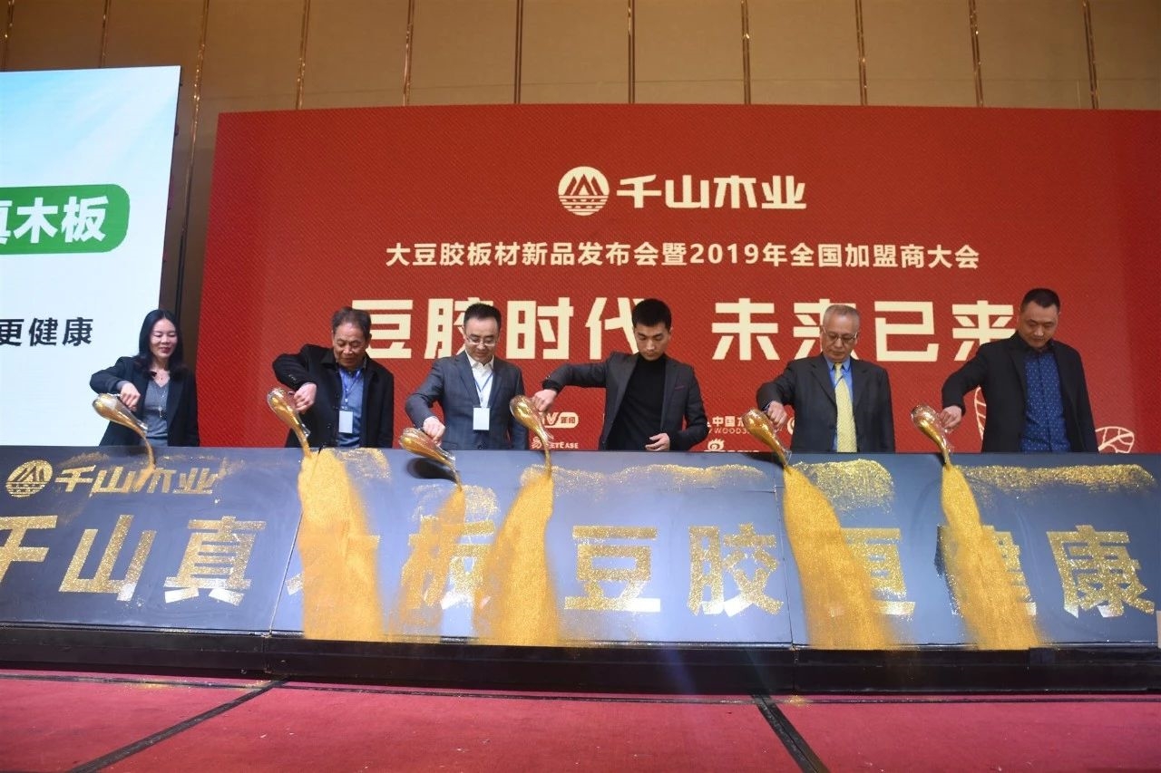 2019年3月21日,在板材之都山東臨沂舉行了“豆膠時(shí)代·未來已來”新品發(fā)布會暨2019年全國加盟商大會。千山大豆膠板材成功上市,意味著板材行業(yè)由脲醛膠E0級時(shí)代跨入植物豆膠新時(shí)代!