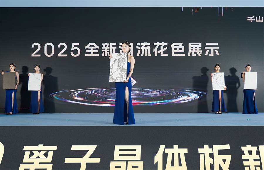 作為本次發布會的又一重頭戲,千山板材2025新品花色也成為了眾人矚目的焦點,王總揭開其神秘面紗:布紋系列—云錦灰布紋、云錦白布紋,石紋系列—鐵銹紅、輕奢水磨石、白玉洞石、水墨潘多拉、冰紋奢石,數碼系列—寶格麗白、灰影木、白影木。