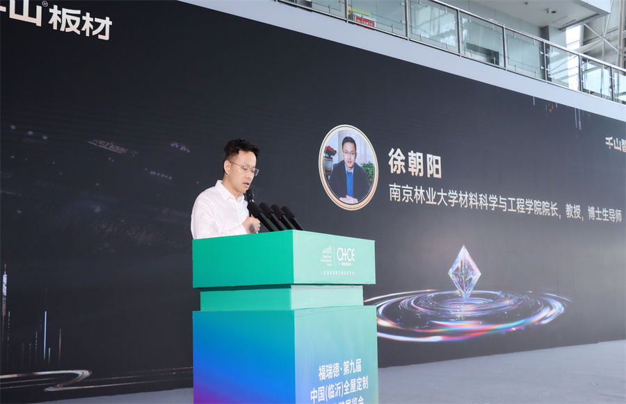 南京林業大學材料科學與工程學院院長徐朝陽致辭。徐院長表示,千山作為家居板材領域的領航企業,始終秉承“健康、環保、創新”的理念,以卓越的產品力和市場表現力贏得了消費者的信賴。T20離子晶體板是千山與學院共同研發,不僅延續了千山板材一貫的高品質,更在物理性能上實現了全新的突破。