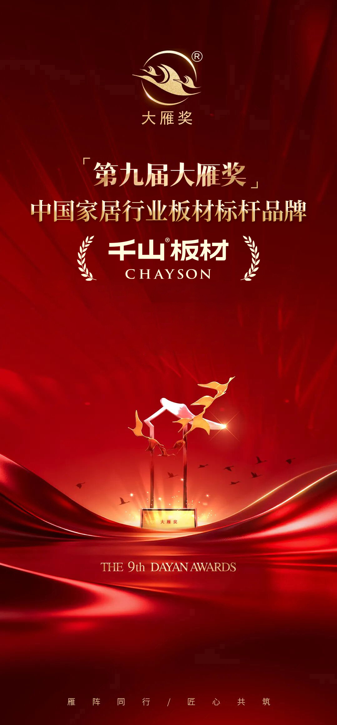 榮譽加冕,亦是全新起點。此次摘得大雁獎,是行業與市場對千山板材的雙重肯定,更是其持續前行的動力。未來,千山板材將繼續堅守 “高質價比” 定位,深耕技術研發與產品創新,與行業同仁攜手同行、匠心共筑,以硬核實力推動板材行業品質升級,持續助推中國家居產業高質量發展,為千萬家庭打造理想家!