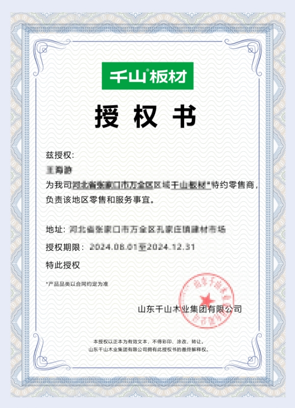 為了廣大消費(fèi)者的切身權(quán)益和消費(fèi)體驗(yàn),購買產(chǎn)品時,應(yīng)選擇千山板材授權(quán)的銷售渠道,可查看經(jīng)銷商授權(quán)證明文件。