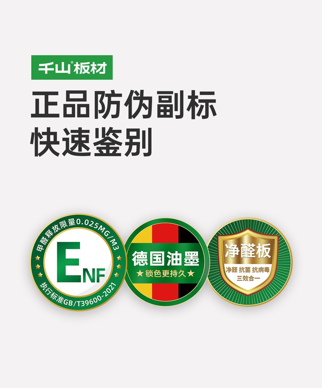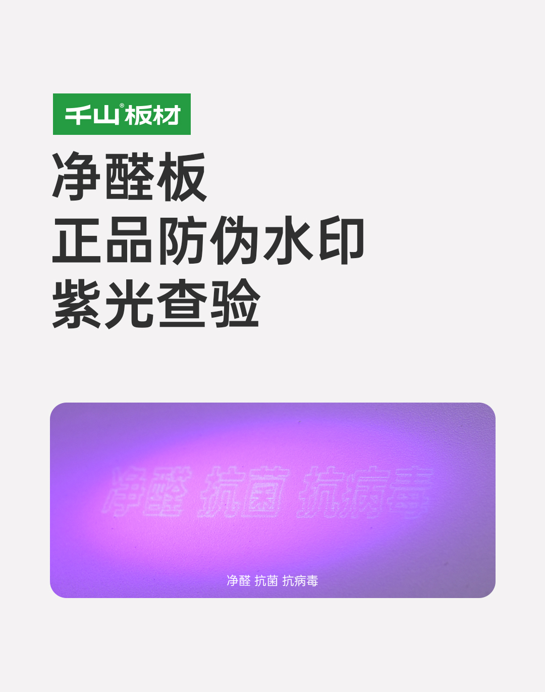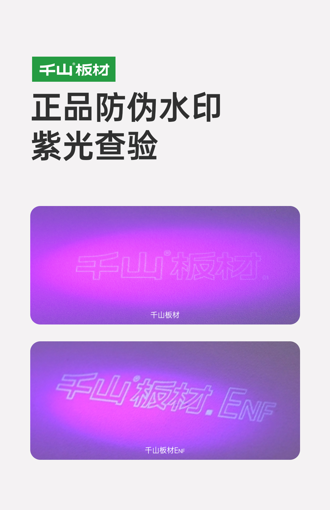 正品千山板材表面都印有隱形防偽標(biāo)識,使用紫光手電筒照射板材表面,顯現(xiàn)“千山板材” 或 “千山板材ENF”水印,凈醛板顯現(xiàn)“凈醛 抗菌 抗病毒”水印。