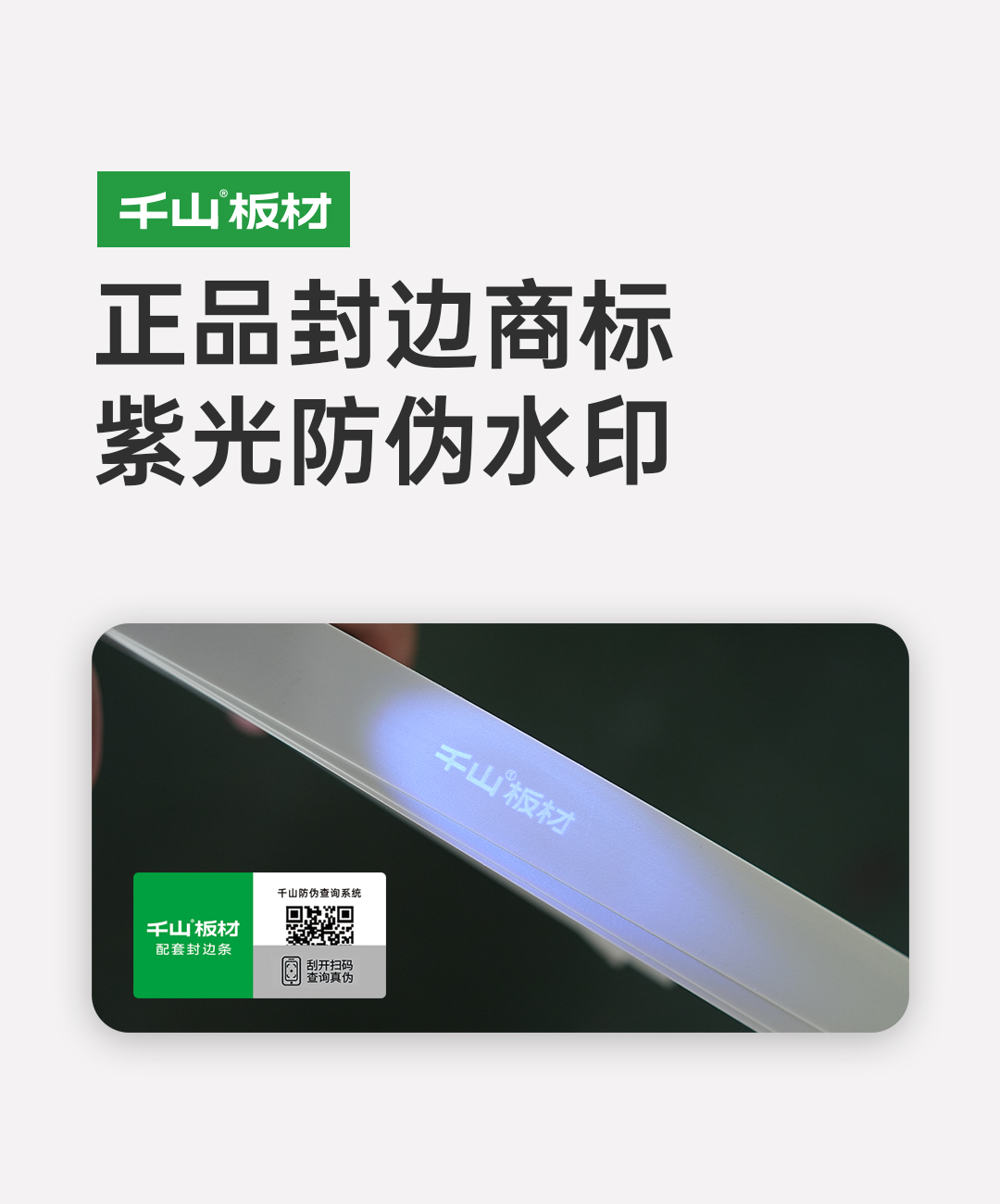 正品配套封邊皮有千山板材防偽商標(biāo),刮開圖層后可掃碼查詢真?zhèn)危?/span>用紫光照射查驗(yàn),顯示“千山板材”防偽水印。