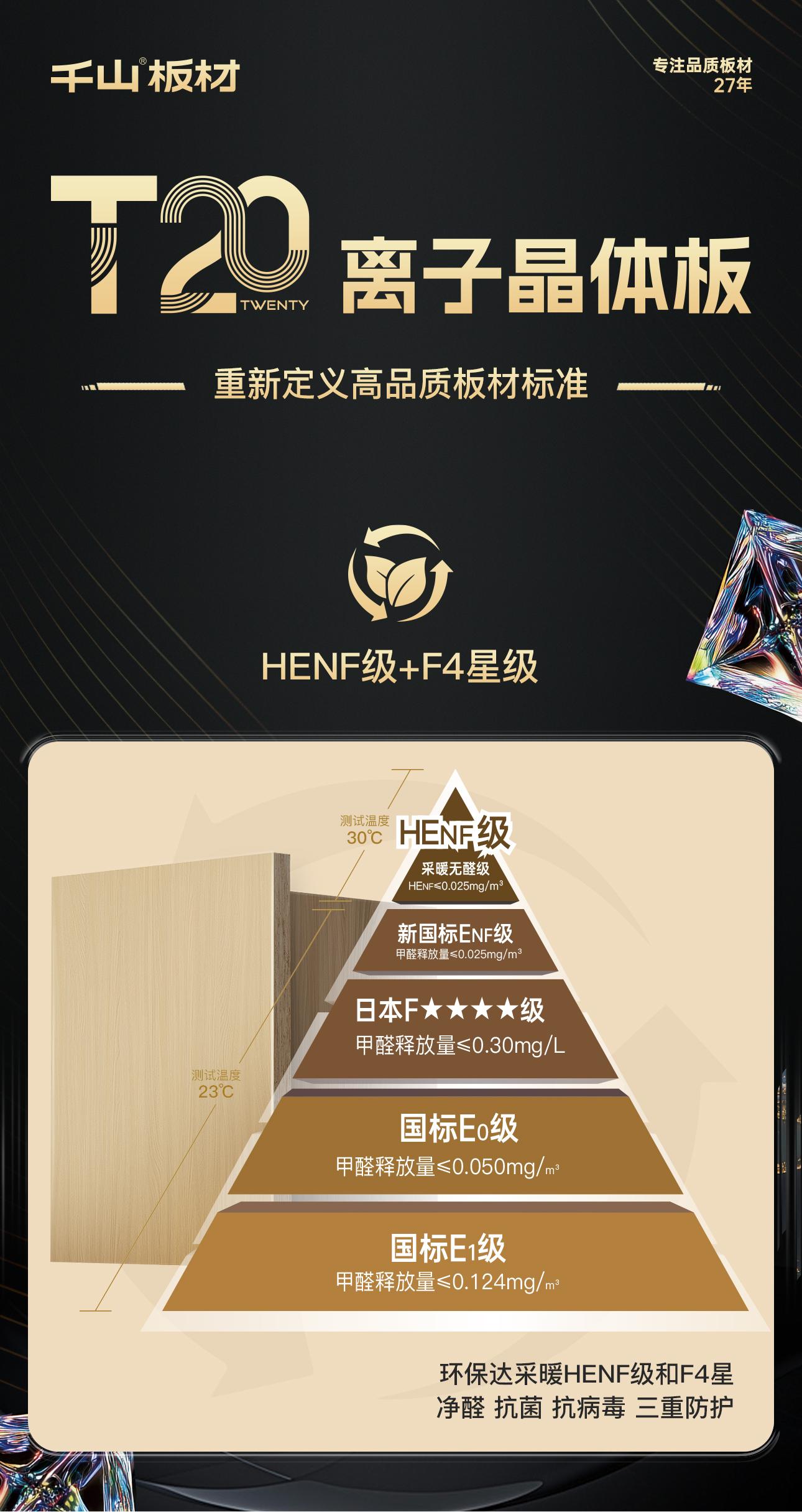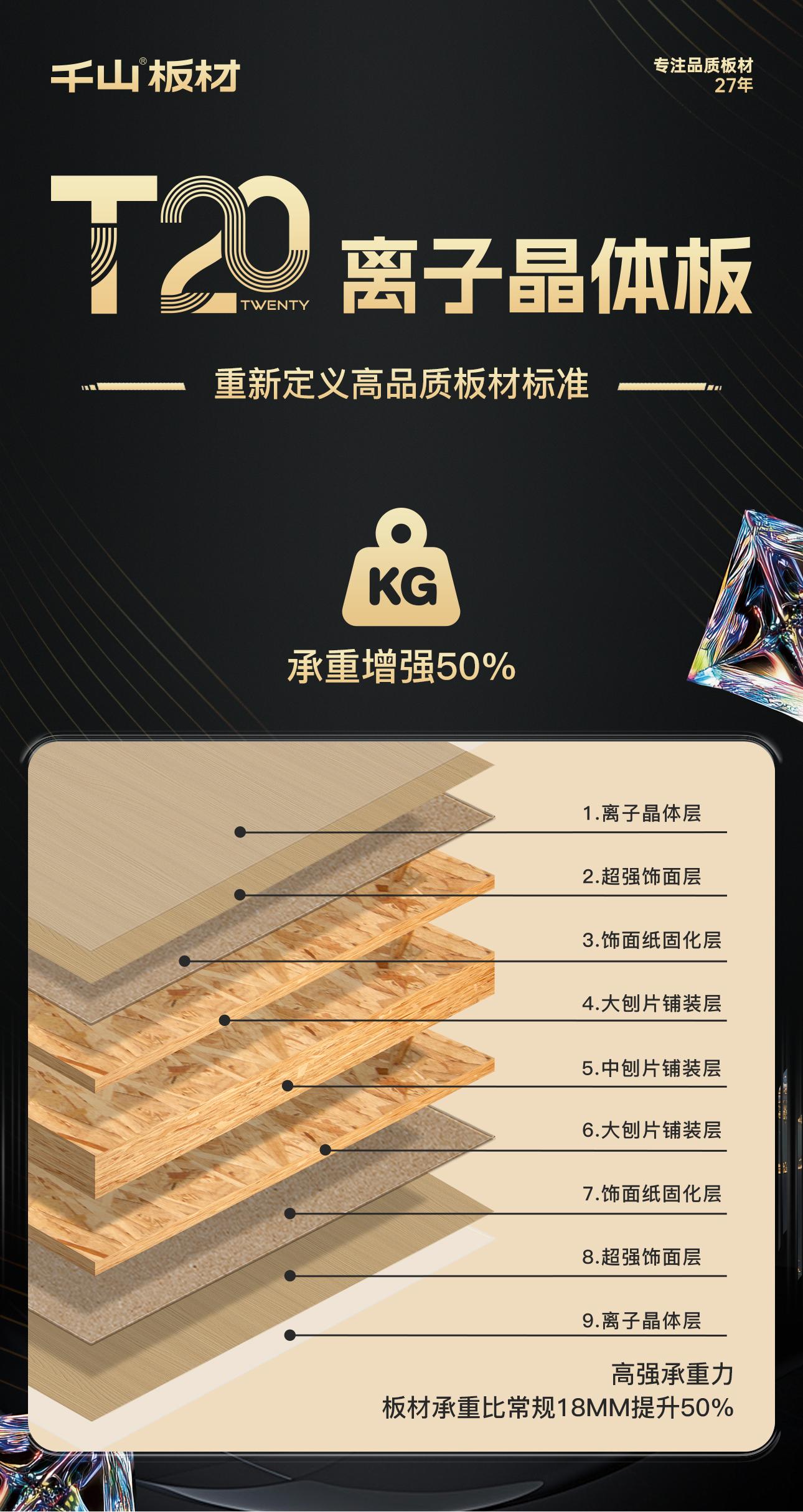 千山板材重磅推出T20離子晶體板,以20mm厚度、高強承重、高能抗變形、超強耐磨的優異性能,顛覆傳統門板的性能界限,重新定義高品質板材標準,實現產品穩定性與空間美觀性的極致效果,成就柜體柜門通配、一門到頂的超能應用。